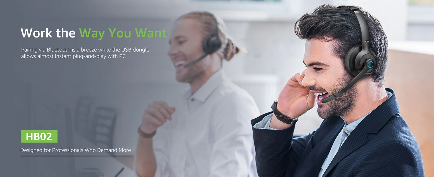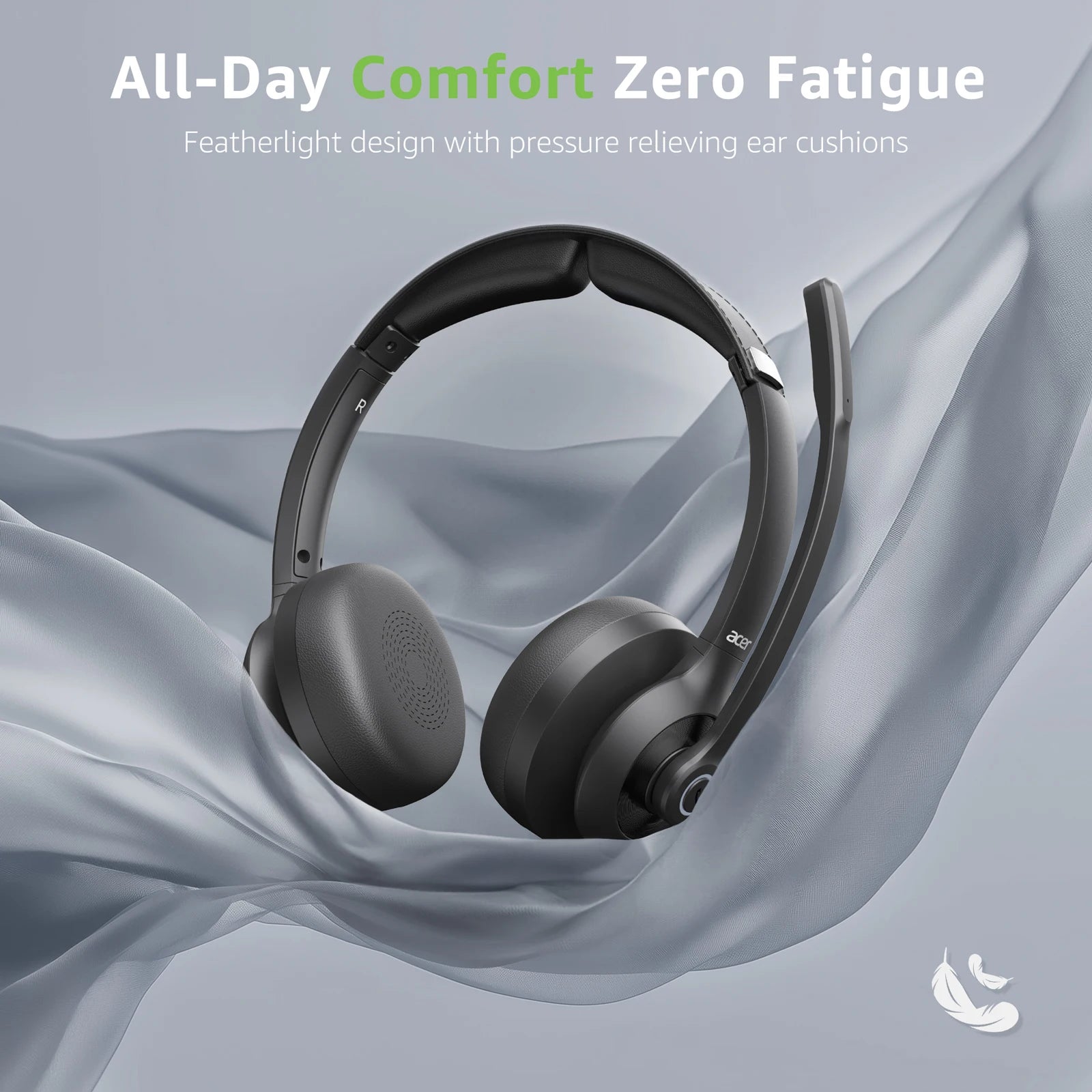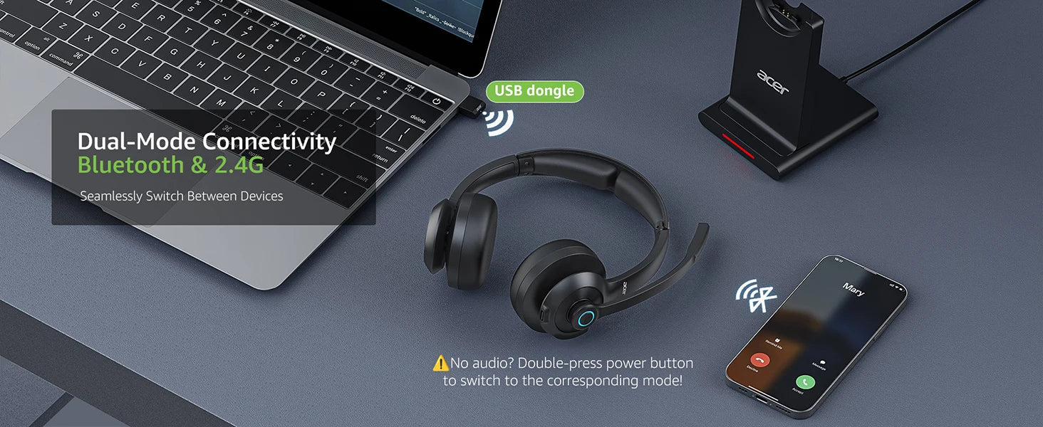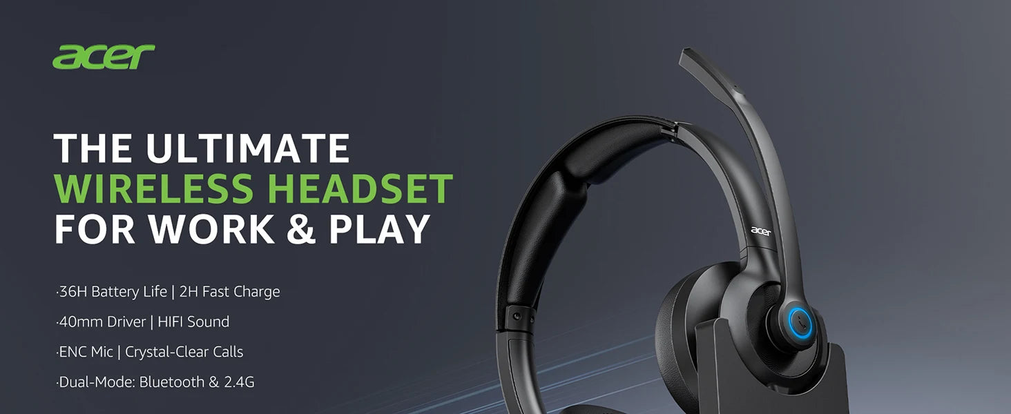 Acer HB02 Call Center Wireless Headset with Mic for Work 2.4G USB Dongle Bluetooth 5.3 Dual Mode Headphones ENC Clear Calls for Teams, Skype, Zoom
