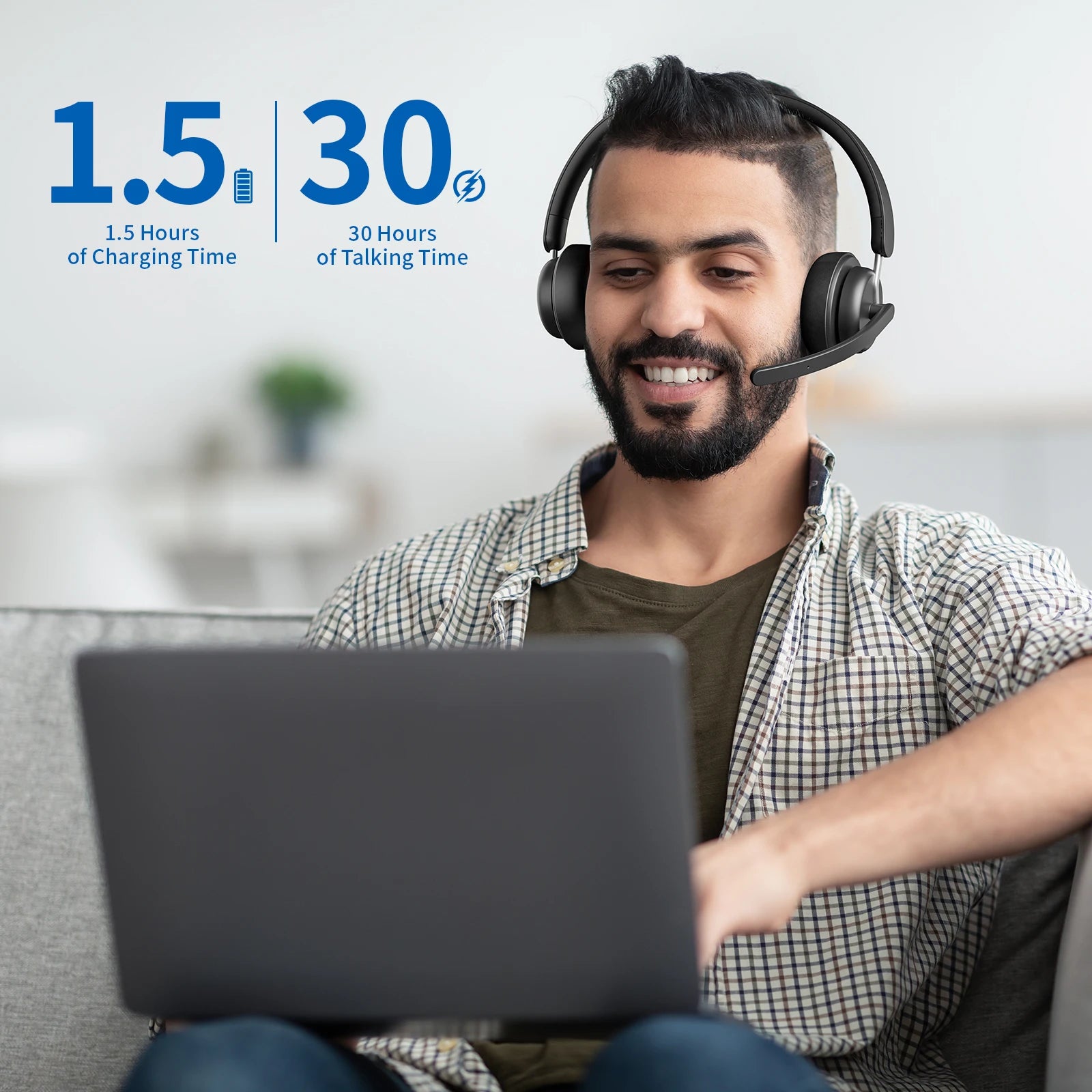 30H Battery Life & Unique Charging Base: Only 2.5H on a single charge, the wireless bluetooth headset gives you up to 30H of continuous talk time and 300H of standby time, enjoy uninterrupted entertainment and long-lasting battery life. The wireless headset for pc with a plug-and-play charging base, which you can use for wireless charging or a TYPE-C charging cable.