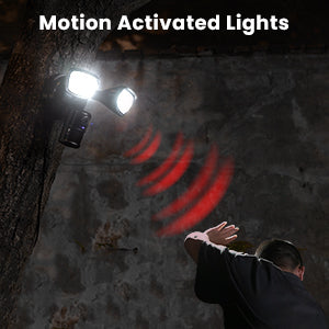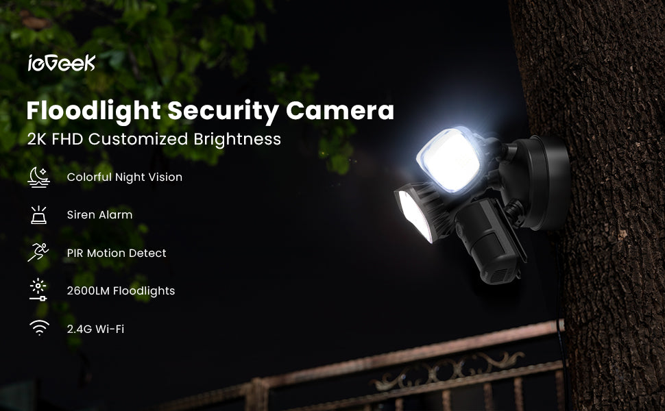 The flood light camera outdoor has a 150° motion sensor that will activate the 2pcs 6000K floodlights and alarm system if someone enters the detection range. You will receive a real-time notification on the ieGeek Cam App.