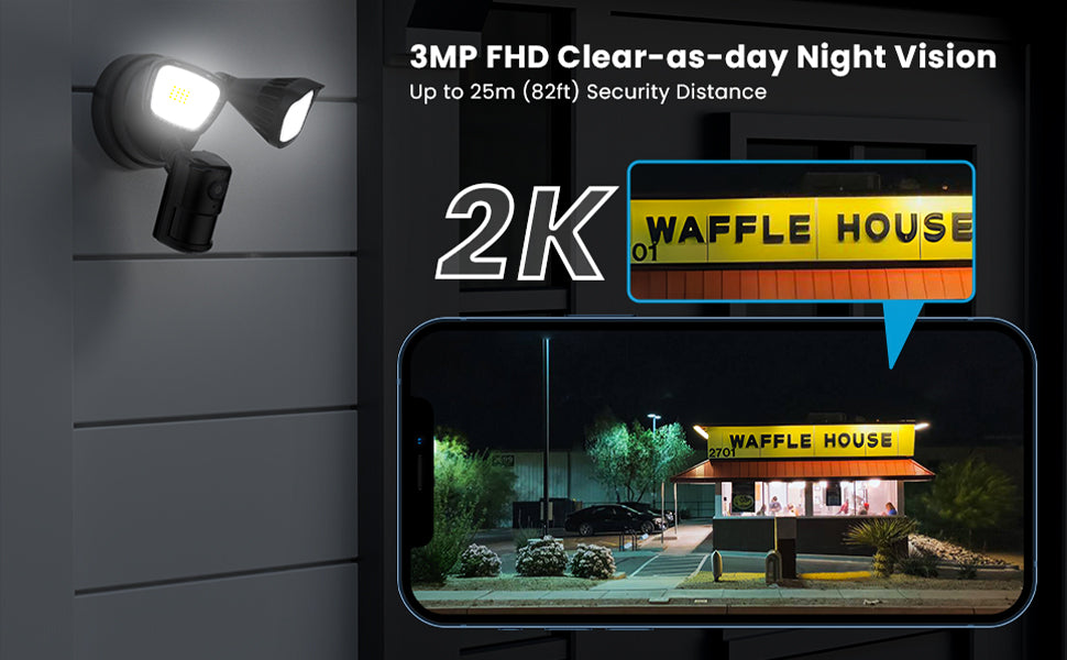 【2K Video Colorful Night Vision】 ieGeek outdoor camera has a 1/2.7'' 3Mega CMOS image sensor resulting in 2K 3MP pixels. Ultra-bright flood light security camera brings up to 25m color night vision, with a 130° View Angle, the security camera presents a wider full-color lane and protects the safety of vehicles in all directions.