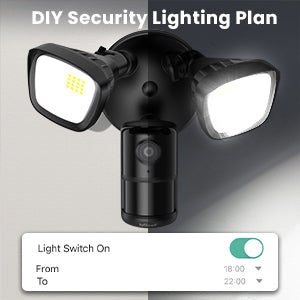 The floodlight camera outdoor has a built-in intelligent control chip that lets you set the light to be always on or customize the lighting time. The security light with camera will automatically turn on at the corresponding time. You also can turn on or off light and siren freely.