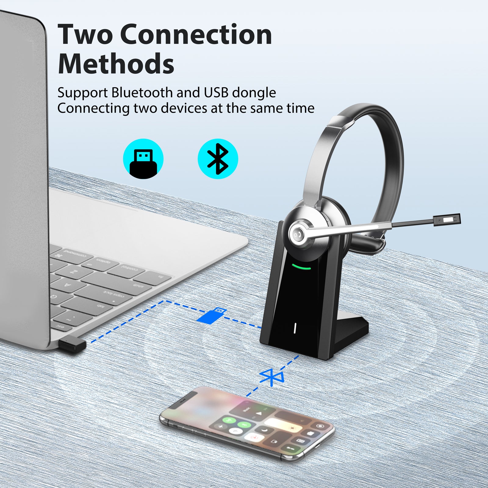 Seamlessly connect via Bluetooth or 2.4GHz wireless USB dongle, giving you the flexibility to use the headset across laptops, desktop PCs, and mobile devices. The dual-mode connection ensures stable performance with low latency, making it ideal for calls, video meetings, and everyday professional use.